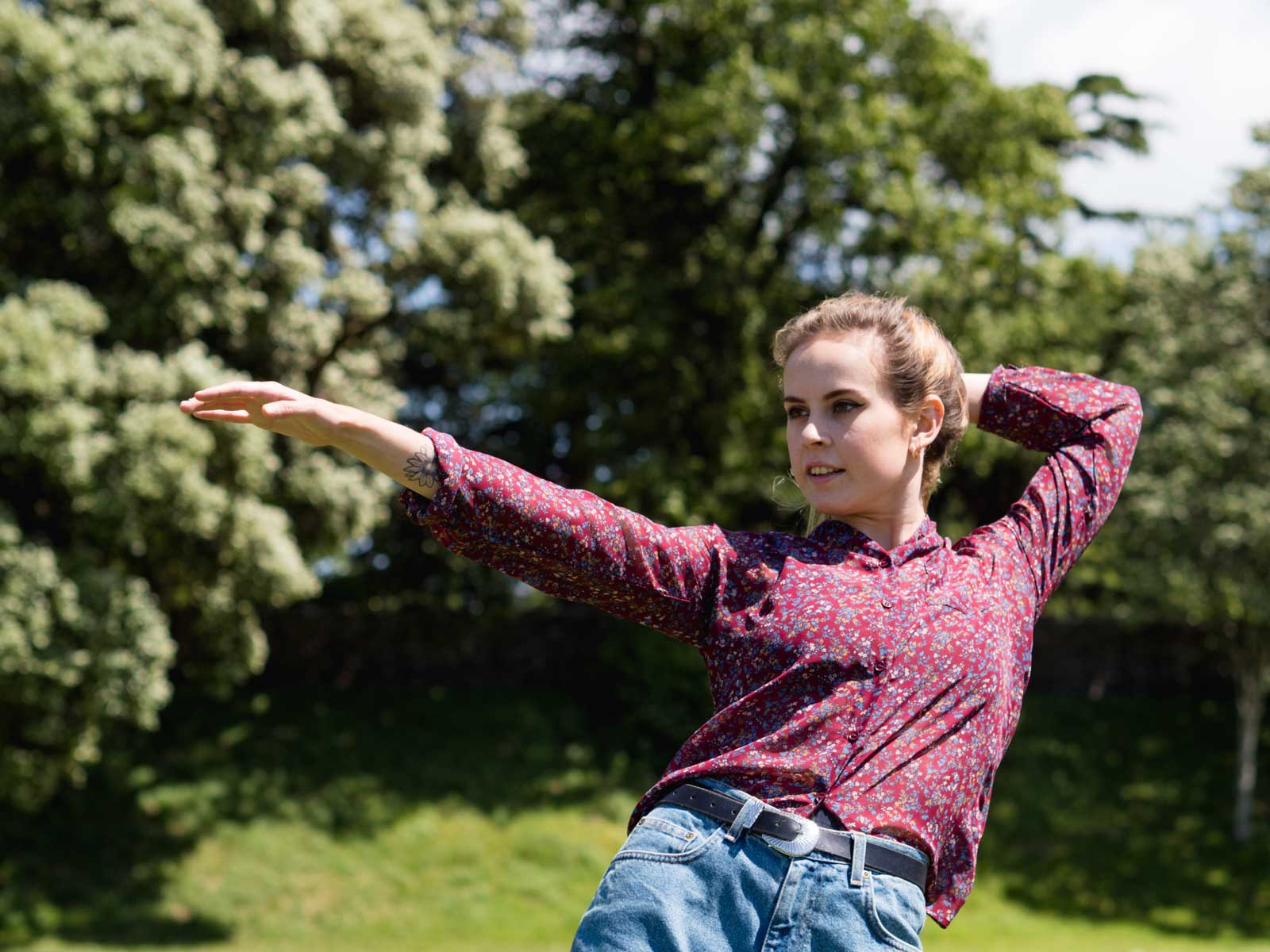 Contemporary dancer is outdoors and leans backwards with an extended arm and a hand behind her head.